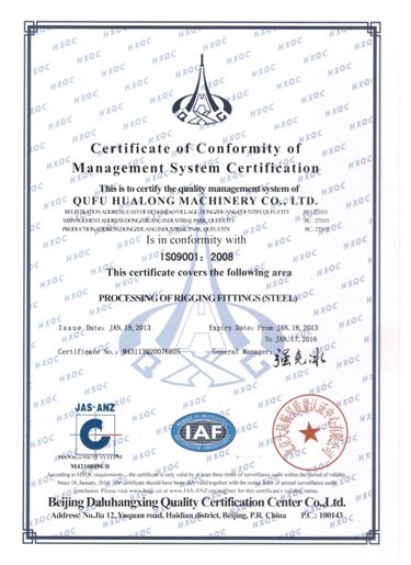 Qufu Hualong Machinery Co., Ltd. was established in 2001 March, is an independent business limited liability company. The company is located in historical and cultural city in China- Qu Fu city. Business scope: production and sales of various types of steel wire rope is connected with the rigging accessories, main products have steel swaging sleeves, swage duplex sleeves, stainless steel sleeve, a variety of precision parts of different kinds of hundreds of specifications. Product quality and stability, especially the technical indexes of the steel sleeve is not less than or more than Crosby S505, S506, S409, S510 sleeve, and as the manufacturer in china at present,we could independent R & D and production according to customer requirements. In 2011 the company has independent import and export right, the products are exported to Europe, North America, South America and other countries and regions, are widely used in bridge, wharf, ship, roads and other infrastructure construction.